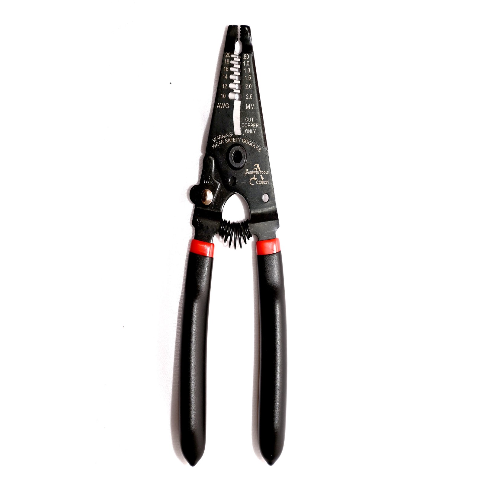 Ashwin tools wire stripper cum cutter – CC 8021 is suitable for consistent stripping of wires from AWG 10 – 22 , comes with Black Oxide SK5 metal body, with TPR handles for comfortable operations for mass production facility at manufacturing units .Â