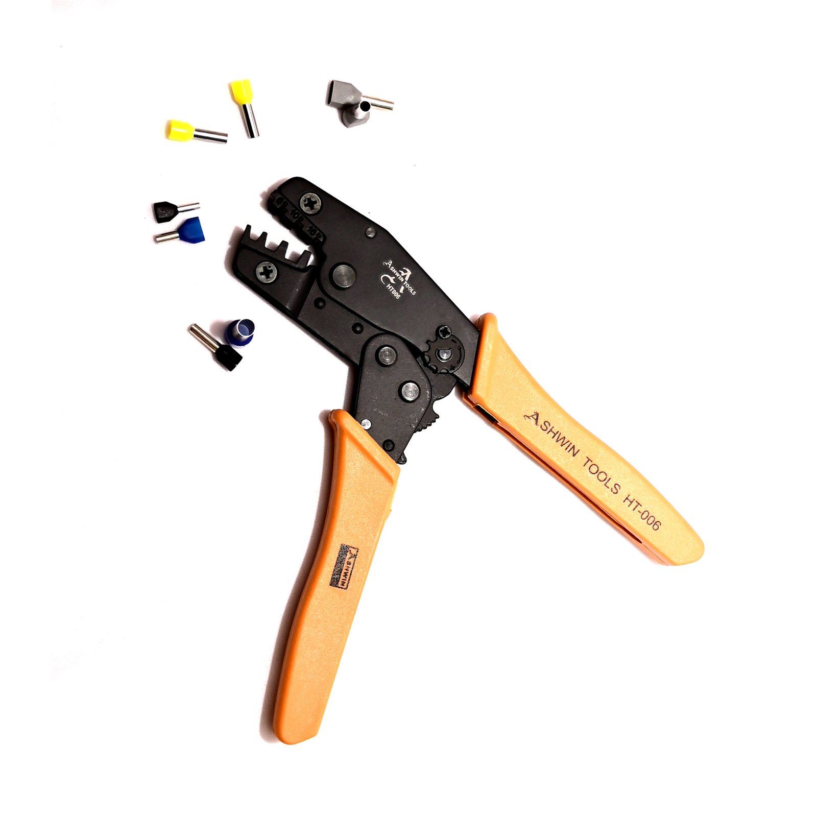 Ashwintools HT 006 is a professional crimping Tool designed for durable use with consistency giving reliable terminals crimp joints , the frame has larger leverage due to bigger frame , which allows increased leverage during the crimping procedure with Rachet mechanism , the Tool comes with interchangeable die set facility .  Â